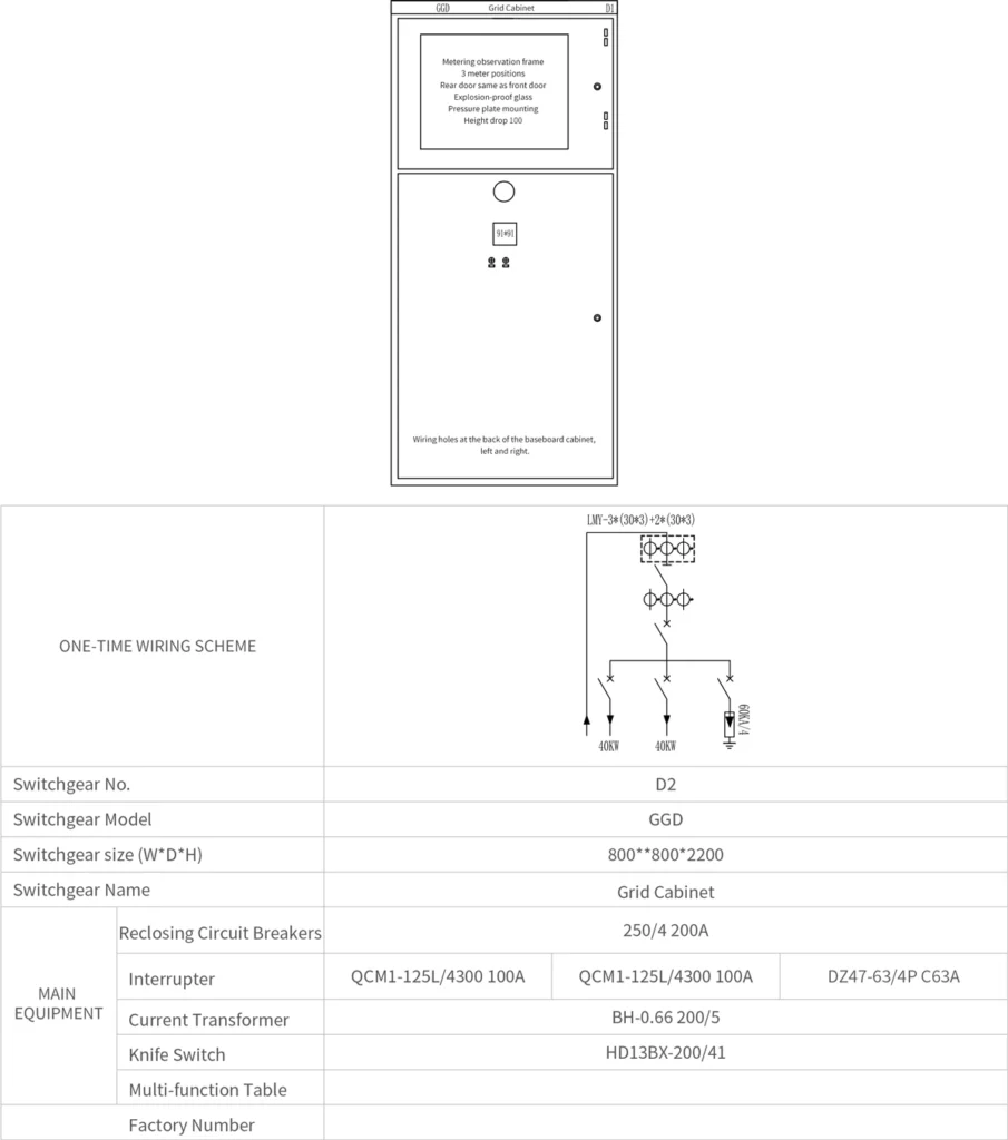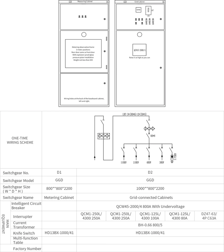 CYBWG photovoltaic grid-connected cabinet is an important part of undertaking centralized inverter and step-up transformer or AC combiner box and step-up transformer, the inlet line of this photovoltaic grid-connected cabinet adopts circuit breaker input or direct input, output adopts circuit breaker or load isolation switch, bus is connected by electroplating or purified busbar, and provides secondary lightning protection, the system rated voltage is AC690V, and the protection level indoor is IP40, IP65 outdoors; Cables for secondary measurement and control, cables with currents greater than 2.5mm^2, cables with voltages greater than 1.5mm^2, cables with control greater than 1.0mm2, current transformers with 0.5 current transformers for measuring current, and 0.2S current transformers for metering transformers. It is also possible to add related functions according to customer requirements. This product adopts professional electrical design and component selection, so that the internal structure of the cabinet is safe, concise, beautiful, convenient for on-site wiring and maintenance, and ensures the stable operation of the equipment for a long time.
