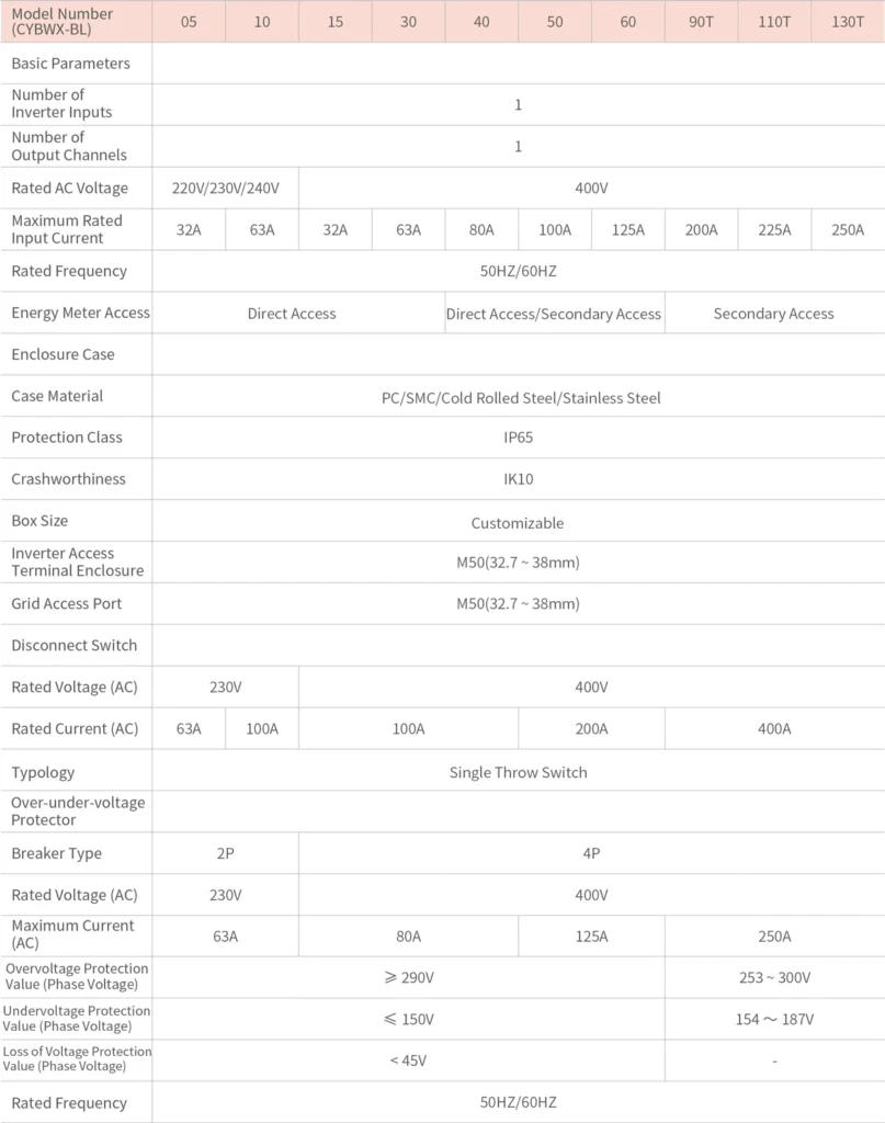 •  The inverter inlet hole of the box is designed at the bottom, which is convenient for direct wiring on site, and the disconnector in the box adopts a well-known brand, and has an obvious break point, and the design capacity is more than 1.5 times the output current of the inverter