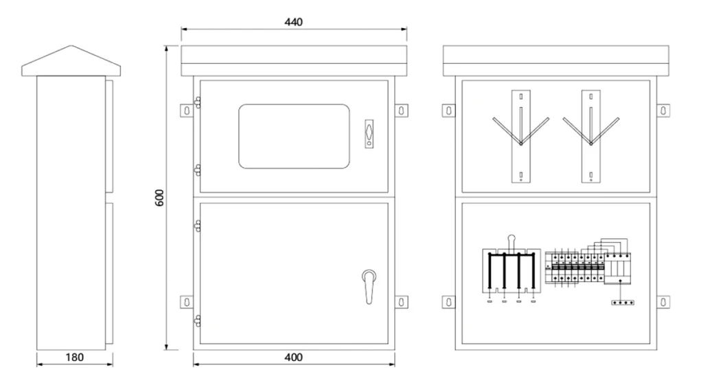 •  The box is designed with lightning surge protection, the standard discharge current of the surge protector is 40KA, and a larger lightning surge protector can be selected in areas with frequent thunderstorms, and the discharge current can reach 100KA