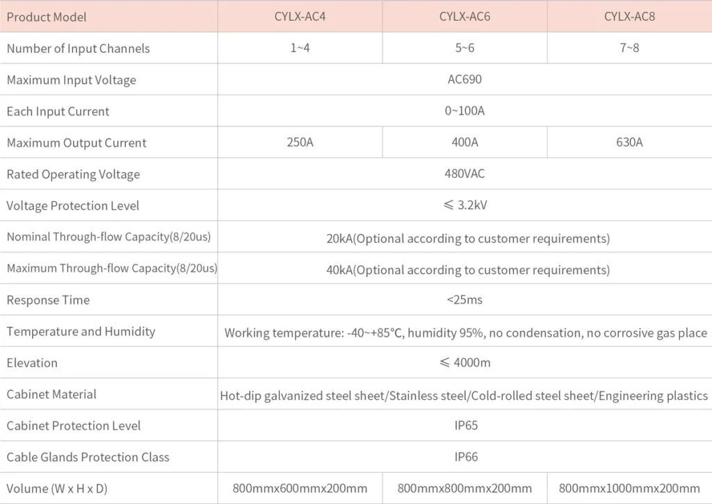 CYLX-AC photovoltaic AC combiner box is suitable for photovoltaic string power generation system, undertake an important part of the string inverter and AC distribution cabinet or step-up transformer, the inlet line of the combiner box adopts circuit breaker input, output adopts circuit breaker or load isolation switch, bus busbar adopts secondary lightning protection after the bus, the system rated voltage is AC690V, and the protection level is IP65 at the same level as the string inverter to meet the requirements of outdoor installation, to meet the requirements of waterproof, dustproof, ultraviolet-proof, anti-salt spray corrosion, etc.