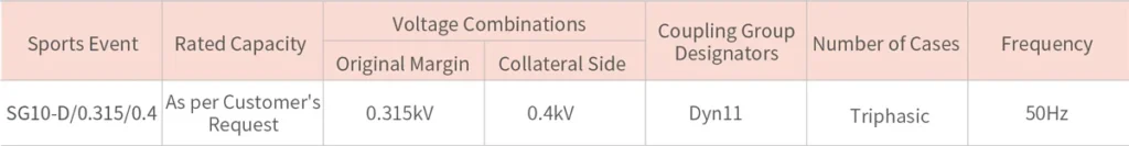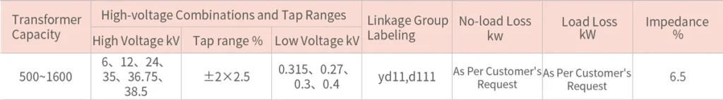 • Rated voltage on the low voltage side: 0.27kV, 0.3kV, 0.315kV, 0.4kV